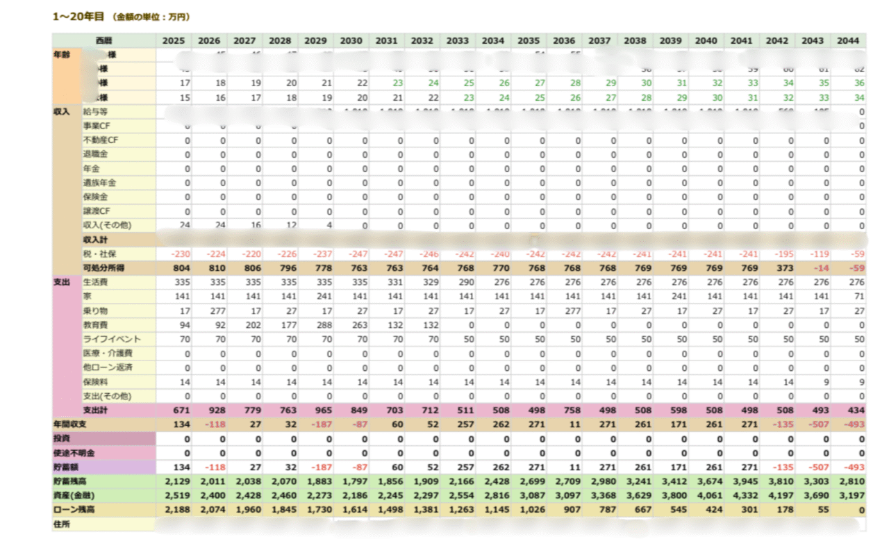 実際に作ってもらったライフプラン表がこれ!いつお金がかかるかが一目でわかって、漠然としていて不安だった将来に見通しが持てたよ。