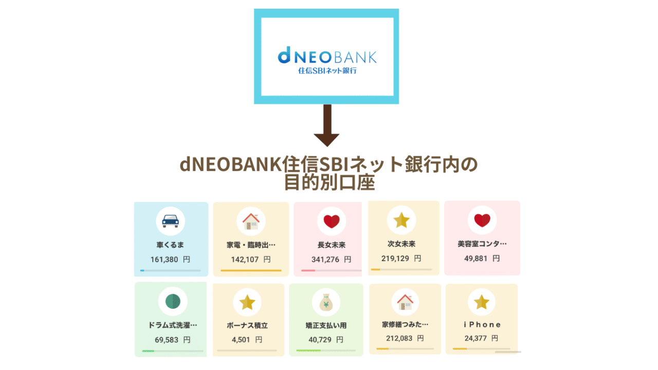 貯金は、dNEOBANK住信SBIネット銀行内の目的別口座に振り分けられるよ◎