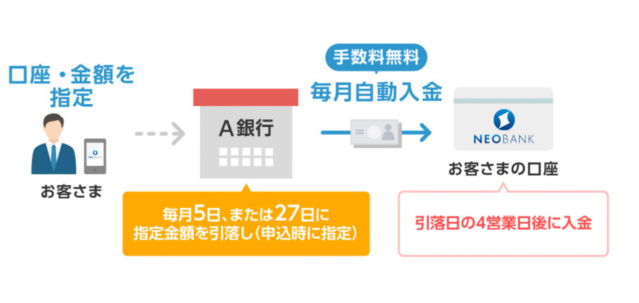 自分名義の他の銀行口座から、自分名義のdNEOBANK住信SBIネット銀行に、毎月自動で入金できるサービス